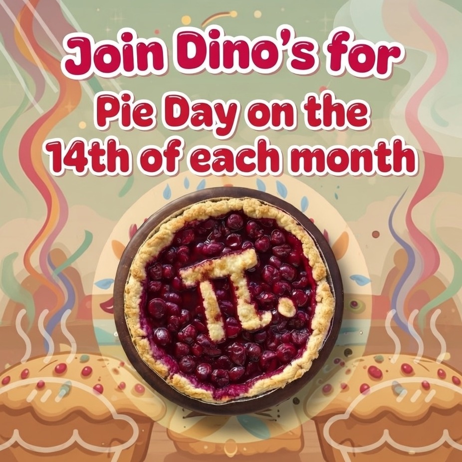 Hi Dino's family, we are excited to announce a new monthly treat. Starting this month and every month following on the 14th, we are proclaiming it , PIE DAY! Yes, the 14th of each month we will be serving pie by the slice as well as taking order for whole pies.